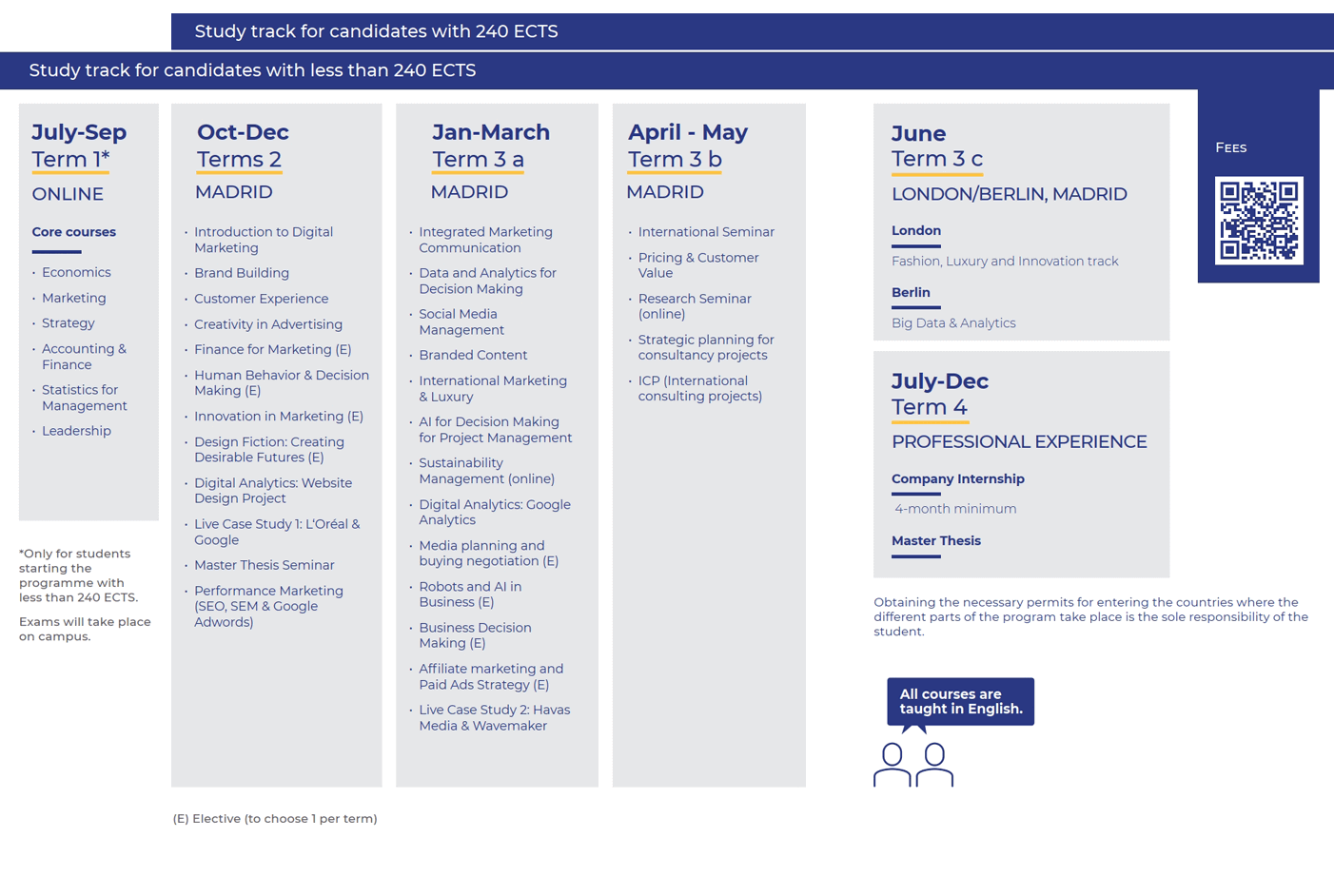 1er term online- solo para alumnos que comienzan el programa con menos de 240 ECTS. 2do. Term en el campus de Madrid y 3ero. En Madrid + Londres o Berlín + Seminario Internacional + Proyecto Internacional de Consultoría.